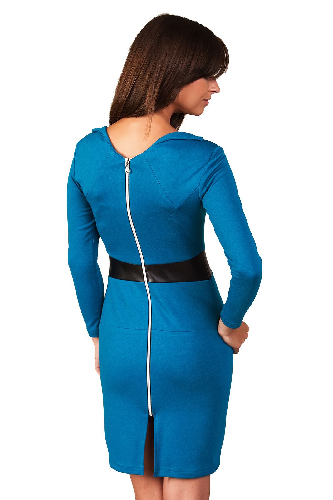 Efektowna, dopasowana sukienka z wysokogatunkowej elastycznej dzianiny, bez podszewki. W pasie oryginalna wstawka z eko-skóry. Z tyłu zapinana na ozdobny zamek błyskawiczny.